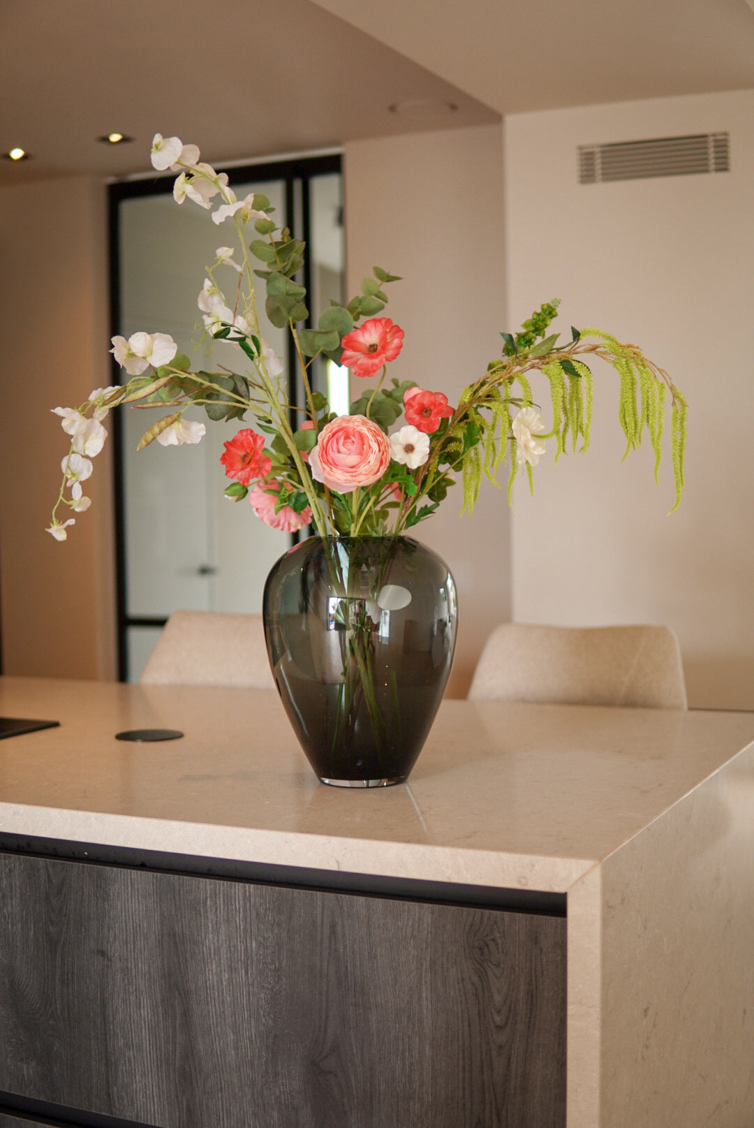 Dankzij het speelse ontwerp oogt het boeket licht en ruimtelijk, ideaal voor op een kookeiland, bijzettafel of dressoir. De lange, sierlijke vormen geven het geheel net dat beetje extra karakter, zonder dat het te druk wordt.