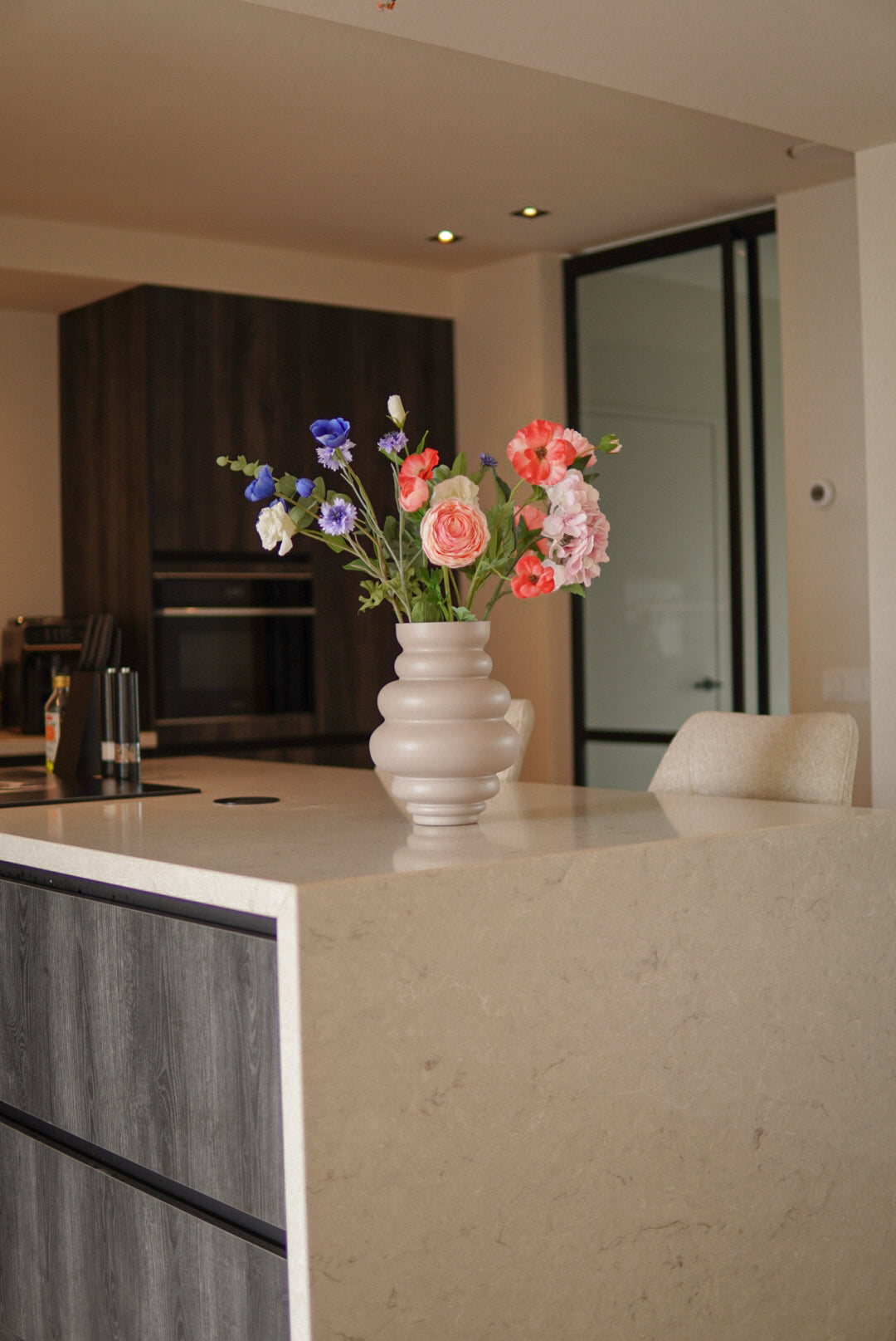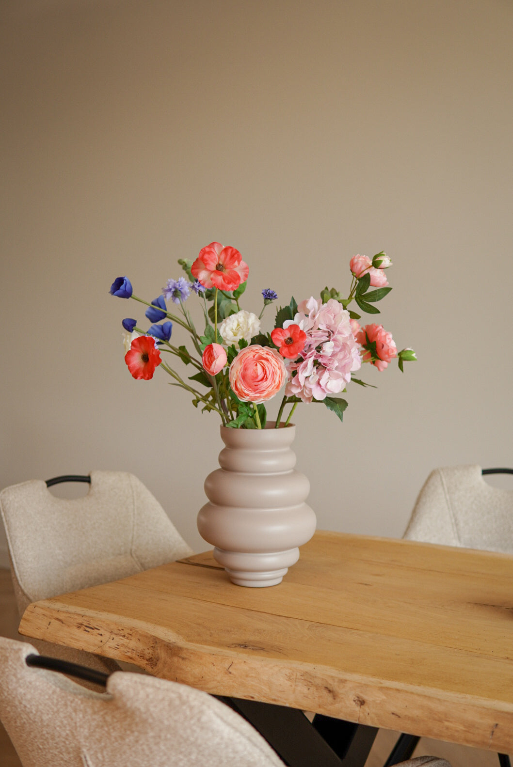 Dankzij de losse, luchtige stijl oogt het boeket modern en natuurlijk, en past het moeiteloos in elk interieur van landelijk tot Scandinavisch. Het kleinere formaat maakt het bovendien ideaal voor kleinere tafels of als stijlvol accent op een kastje of dressoir.