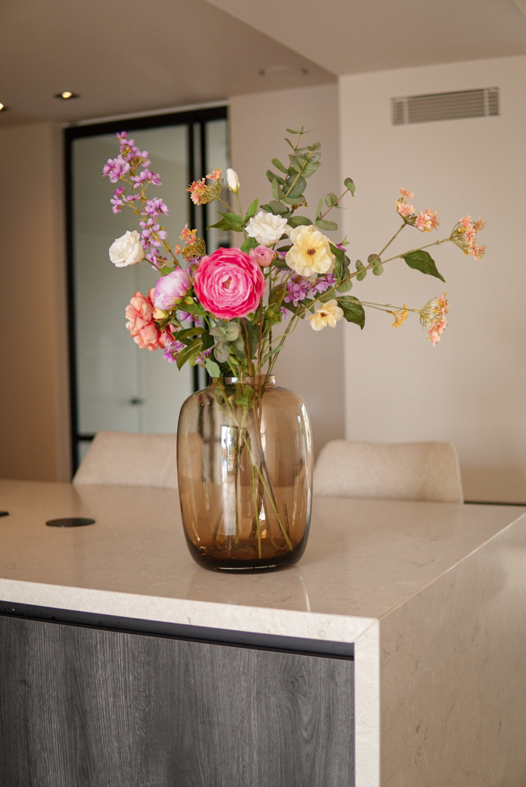 Dankzij het luchtige, losse ontwerp past dit boeket moeiteloos in zowel een modern als een klassiek interieur. Zet het op de keukentafel, een dressoir of geef het een prominente plek op je keuken, en de ruimte krijgt direct meer sfeer.