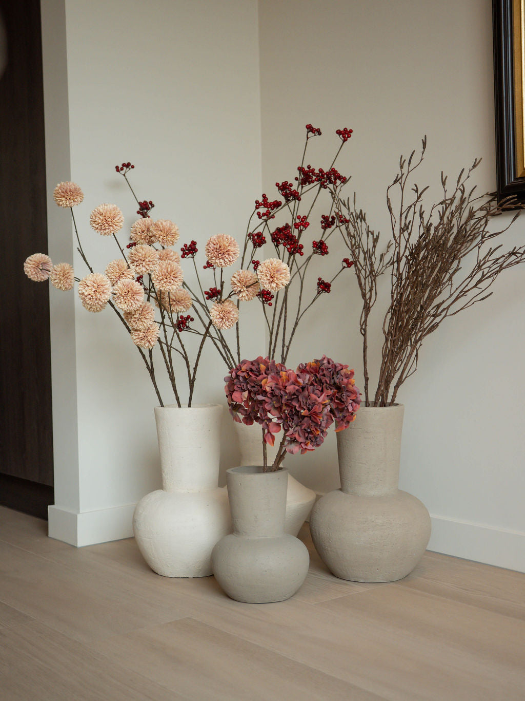 Combineer de taupe Rianne met onze pompom takken of droogbloemen voor een elegant en harmonieus geheel.
