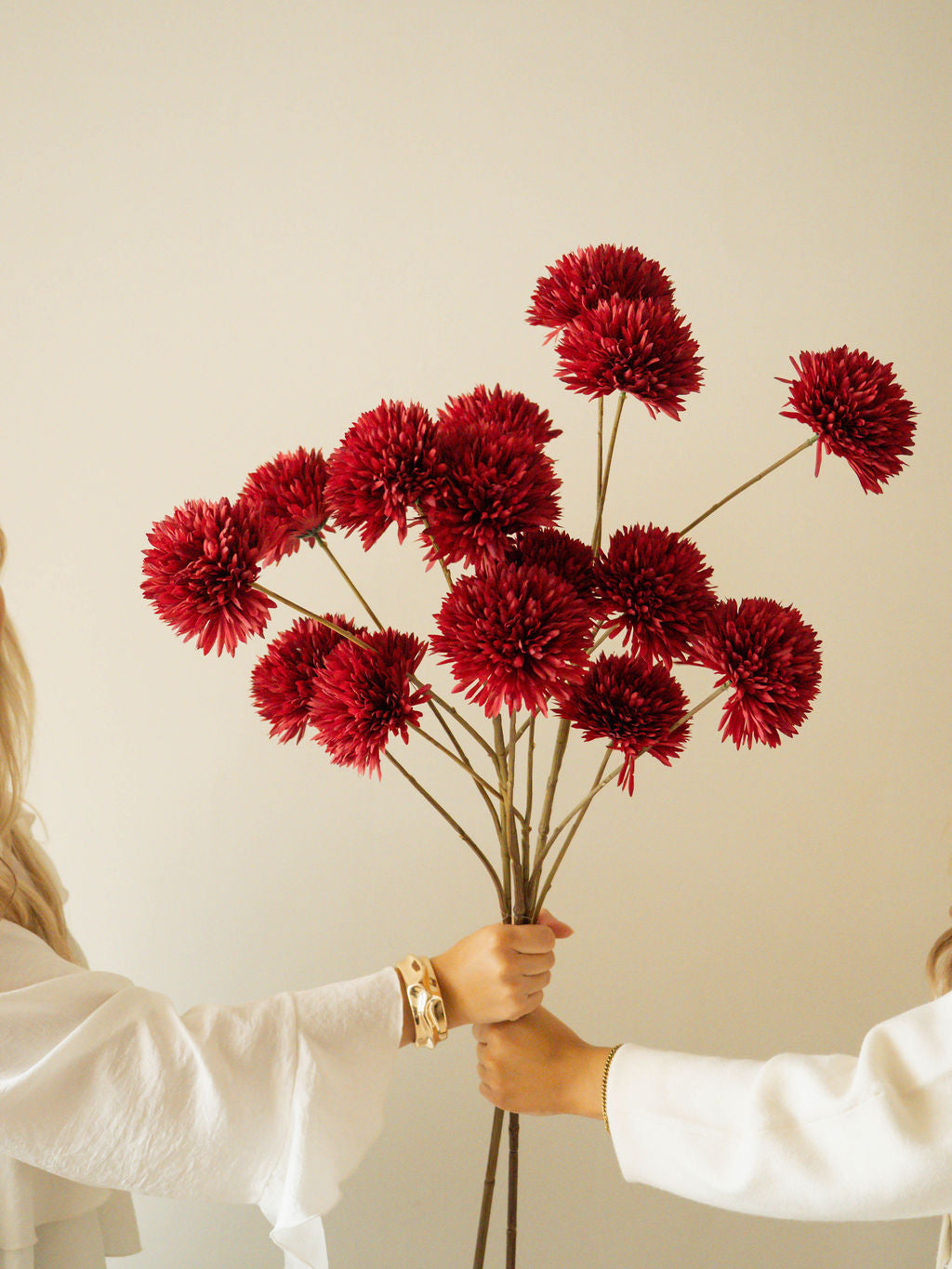 Deze prachtige pompom takken in de stijlvolle kleur rood wijn brengen warmte en elegantie in elk interieur. De volle, ronde bloemen zorgen voor een speels maar luxe effect en staan prachtig in een hoge vaas op de eettafel, het keukenblad of een dressoir.