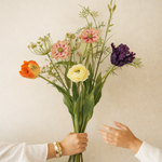 Tulpenfeest - Liv boeket is een fris en speels boeket met een sterke knipoog naar Nederlandse trots. In deze bos zitten een paarse tulp met speelse raffeltjes, een frisse witte tulp en een stralende oranje tulp! De gele ranonkel voorin zorgt voor een zonnig accent en laat het boeket extra opvallen. De levendige kleurencombinatie en het frisse groen geven de bos een speelse uitstraling. Een vrolijk boeket dat kleur, sfeer en een stukje Holland in huis brengt.